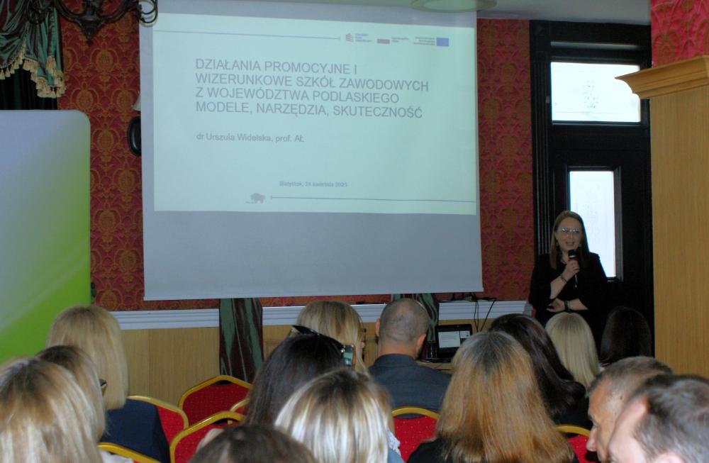 Część merytoryczną seminarium rozpoczął wykład prof. Urszuli Widelskiej z Akademii Łomżyńskiej. Zrealizowane przez zespół pracowników naukowych uczelni badanie skupiało się na analizie modeli i narzędzi działań promocyjnych funkcjonujących w naszym województwie szkół zawodowych oraz ocenie ich skuteczności. Badanie ukazało nie tylko kluczowe wyzwania w promowaniu szkolnictwa zawodowego w województwie podlaskim, lecz także wskazało konkretne działania, które mogą zwiększyć jego atrakcyjność i skuteczność: inicjowanie współpracy między szkołami a interesariuszami, wykorzystywanie mediów społecznościowych czy wdrażanie innowacyjnych strategii promocji i edukacji.